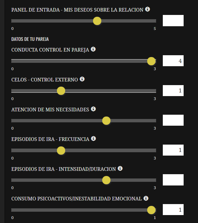 Crees que tu pareja tiene una capacidad de reflexionar y cambiar: Indica un porcentaje siendo el 100 % capacidad total y 0 % una capacidad nula. Para valorar esto, piensa en el modo que asume sus errores e intenta modificr su comportamiento sucesivo, si pide disculpas y realmente cambia algo o vuelve a repetir la misma conducta con el tiempo aunque haya arrepentimiento.