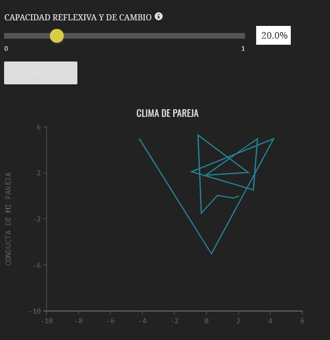 Esta gráfica muestra un "atractor" de tu relación. Este es un concepto que nace de "la teoría del caos" y las ciencias de la complejidad. Viene a ilustrar como los sistemas complejos en determinados regímenes de actividad vuelven siempre a un punto concreto entorno al cual se desarrollan los eventos del sistema. La gráfica muestra en torno a que valores relacionales están continuamente moviéndose los vínculos de pareja, por muchos esfuerzos que la víctima haga para romper estos bucles destructivos.